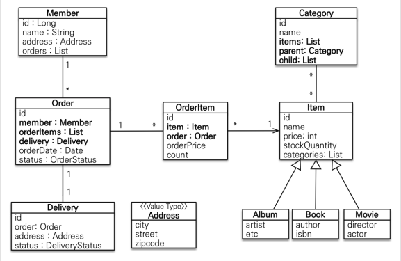 - 회원(Member) : 이름과 임베디드 타입인 주소(Address), 그리고 주문(orders)리스트를 가진다.