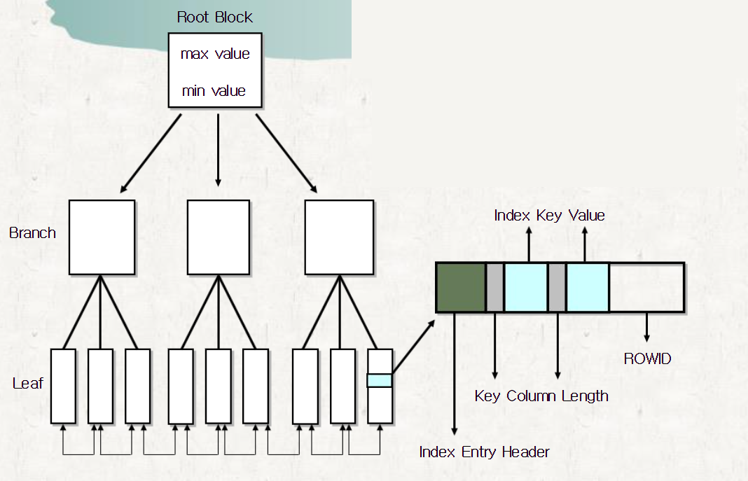 B * Tree 인덱스는 대부분의 DBMS 그리고 오라클에서 특히 중점적으로 사용하고 있는 가장 보편적인 인덱스입니다. 구조는 위와 같이 Root(기준) / Branch(중간) / Leaf(말단) Node로 구성됩니다. 특정 컬럼에 인덱스를 생성하는 순간 컬럼의 값들을 정렬하는데, 정렬한 순서가 중간 쯤 되는 데이터를 뿌리에 해당하는 ROOT 블록으로 지정하고 ROOT 블록을 기준으로 가지가 되는 BRANCH블록을 정의하며 마지막으로 잎에 해당하는 LEAF 블록에 인덱스의 키가 되는 데이터와 데이터의 물리적 주소 정보인 ROWID를 저장합니다.